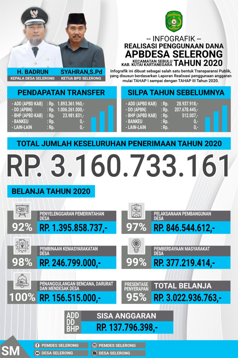 Infografik DesaPembangunanPemberdayaanPembinaanPemerintahanINFOGRAFIK REALISASI PENGGUNAAN DANA APBDES SELERONG, KEC. SEBULU TAHUN 20204 Januari 2021