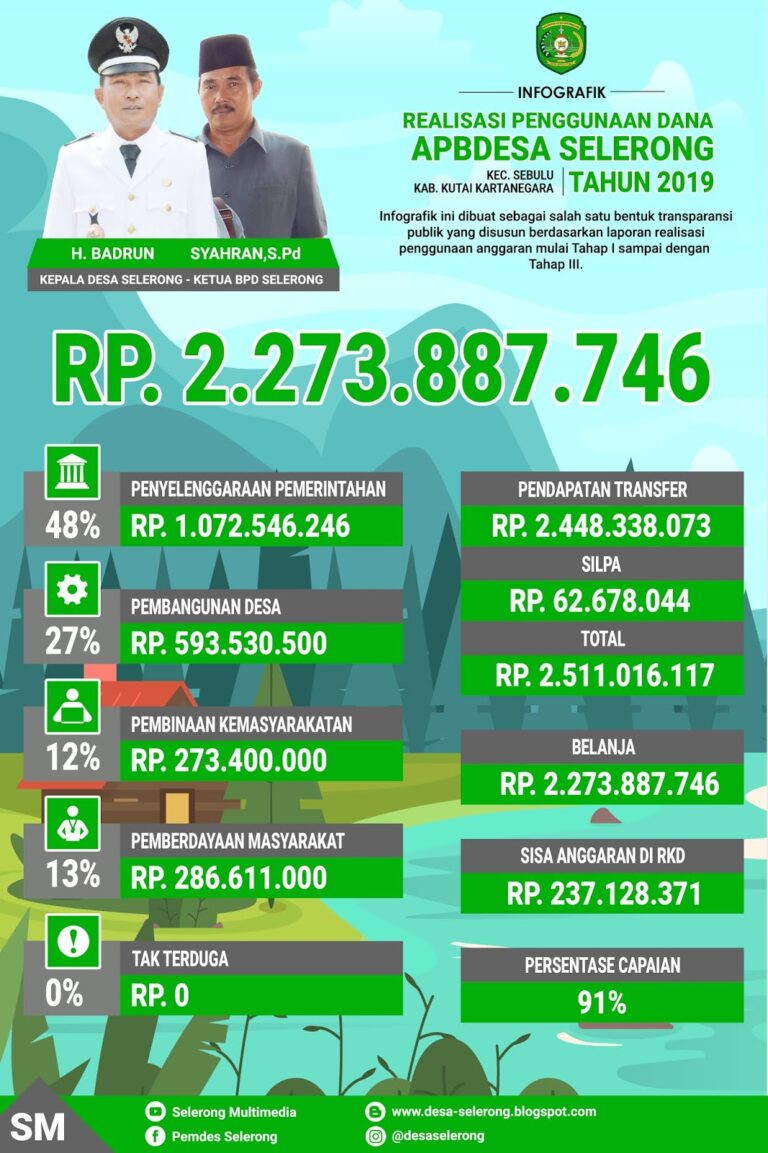 Infografik DesaPembangunanPemberdayaanPembinaanPemerintahanINFOGRAFIK REALISASI PENGGUNAAN DANA APBDES SELERONG, KEC. SEBULU TAHUN 20196 Januari 2020
