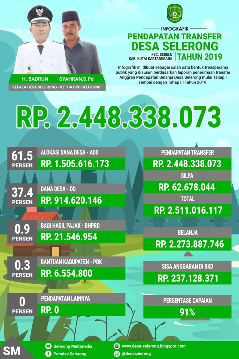 Infografik DesaPembangunanPemberdayaanPembinaanPemerintahanINFOGRAFIK REALISASI PENDAPATAN DANA TRANSFER DESA SELERONG, KEC. SEBULU TAHUN 201923 Desember 2019