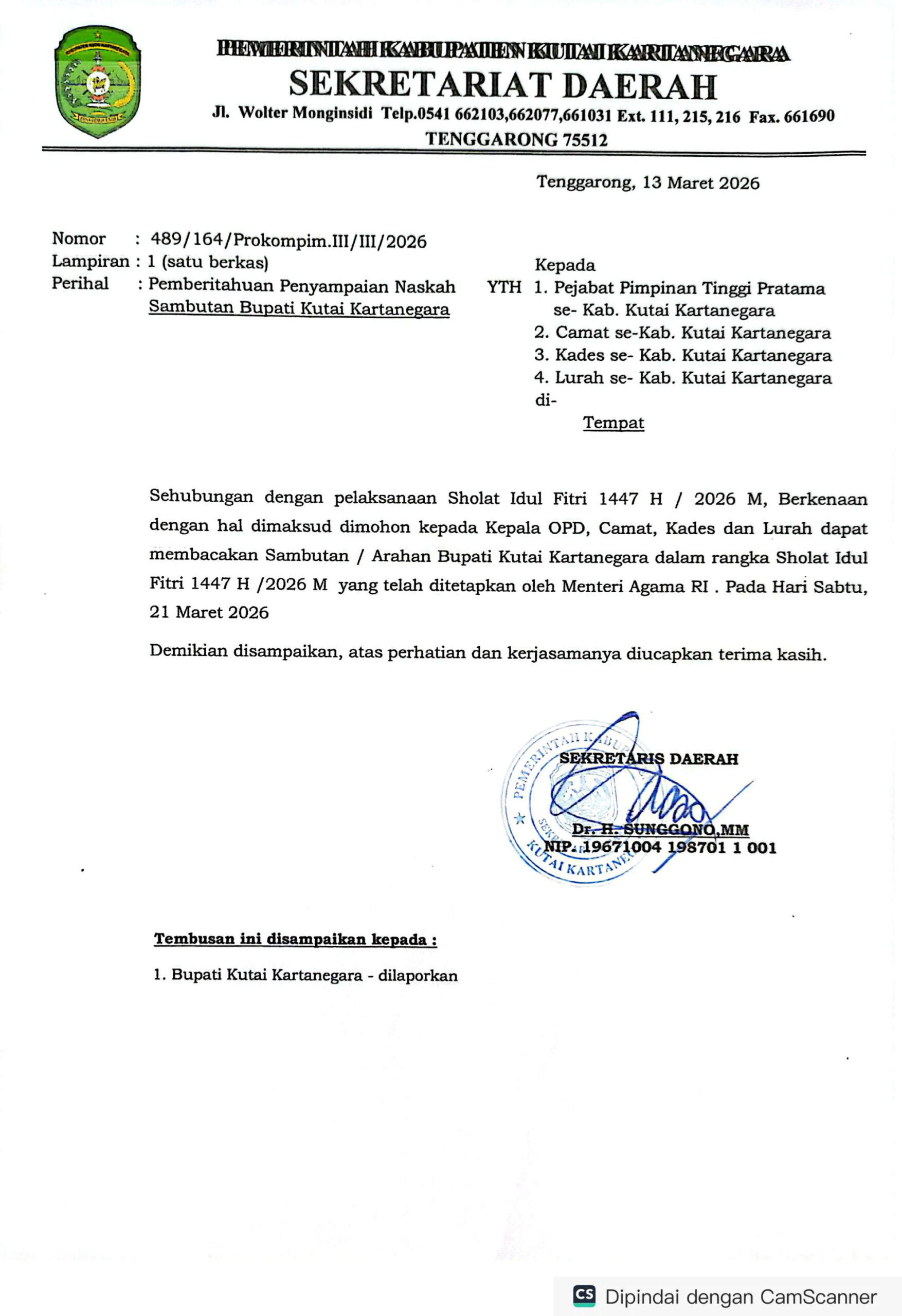 Pemberitahuan bernomor 489/164/Prokompim.III/III/2026 itu diterbitkan di Tenggarong pada 13 Maret 2026 dan ditandatangani oleh Sekretaris Daerah Kabupaten Kutai Kartanegara, Dr. H. Sunggono, MM. Dalam surat tersebut dijelaskan bahwa pelaksanaan Sholat Idul Fitri tahun ini bertepatan dengan 1447 H / 2026 M yang waktunya telah ditetapkan oleh Kementerian Agama Republik Indonesia.