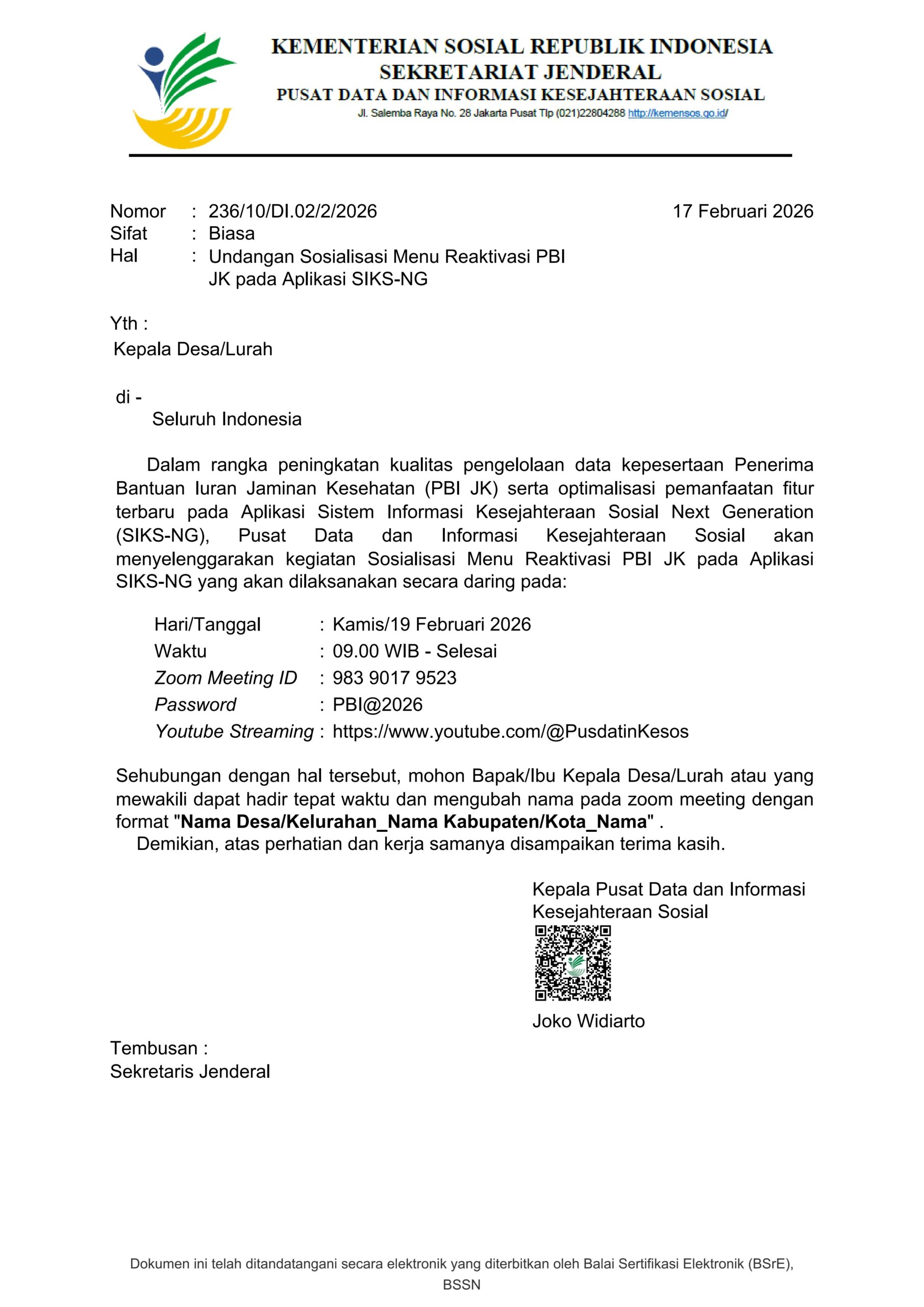 UNDANGAN SOSIALISASI MENU REAKTIVASI PBI JK PADA APLIKASI SIKS-NG
